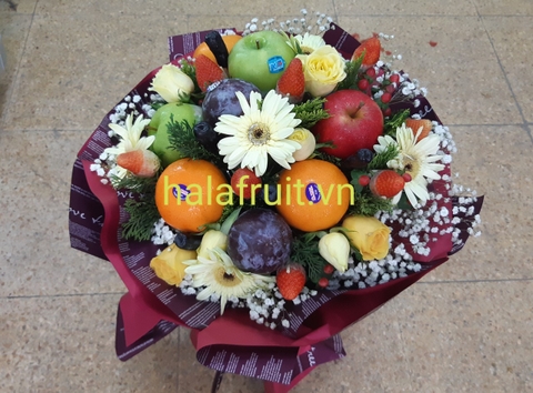 Bó hoa gồm có mận Úc giòn, ngọt, đậm vị. Quýt Úc tươi, ngọt, thơm, táo Rose Mỹ hàng nhập khẩu giòn, ngọt kết hợp với chị chua nhẹ của táo xanh. Hoa quả nhập khẩu kết hợp với hoa tươi tạo thành món quà sang trọng và đẹp mắt với giá cả phải chăng.